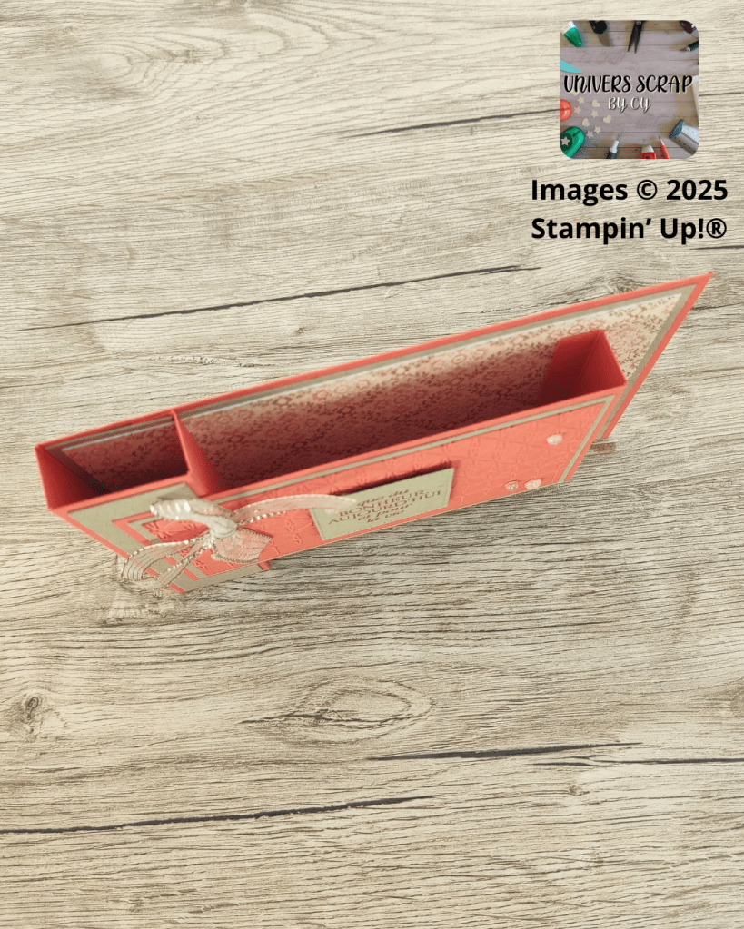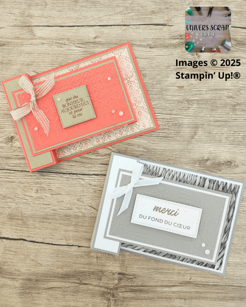 Aujourd’hui, je te propose un projet tout en volume et en raffinement, idéal pour une occasion spéciale ou tout simplement pour faire plaisir. Cette carte a été réalisée avec deux collections que j’adore : Textures tissées et Galerie Splendide, sur une base Ardoise Bourgeoise et Corail Calypso, le tout signé Stampin’ Up!.
