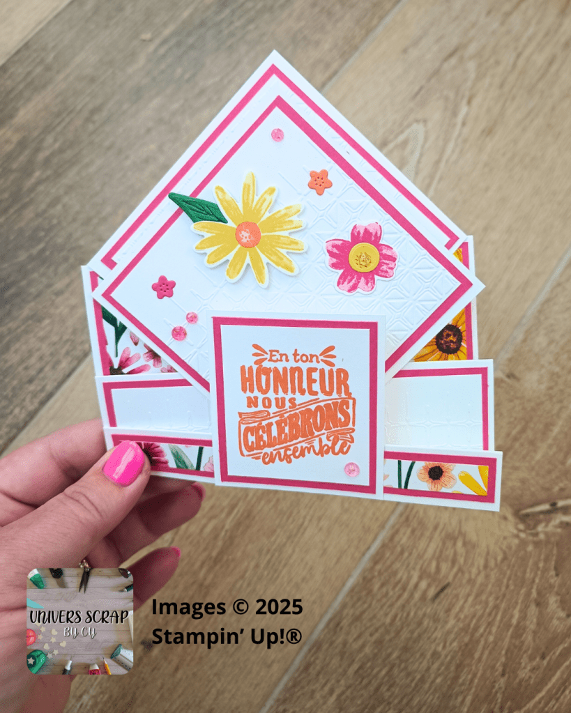 Cette carte double losange est parfaite pour toutes les occasions : anniversaire, remerciement, fête des mères ou simplement pour le plaisir d’offrir. Elle est simple à réaliser, même si tu débutes dans le scrapbooking ou la carterie créative.