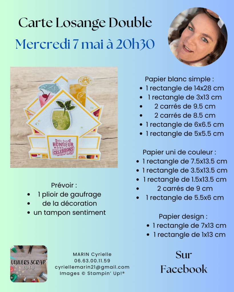 Hier soir, nous nous sommes retrouvés pour un moment convivial et créatif lors d’un nouveau live sur ma page Facebook. Un grand merci à toutes celles et ceux qui ont participé en direct ! C’était un vrai plaisir de créer cette carte double losange avec vous, pas à pas, dans la bonne humeur.