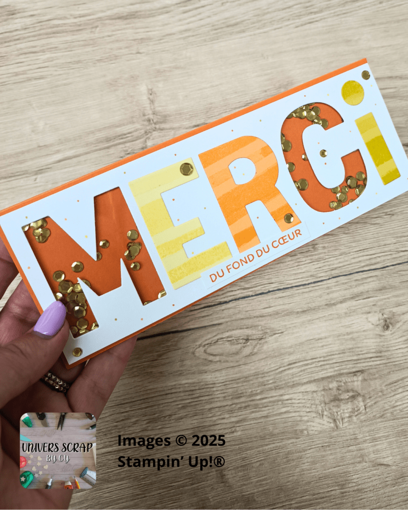 Lors de ce live réservé à mes Stampipelettes et clientes fidèles, nous avons créé ensemble une shaker card dynamique et joyeuse, dans un combo de couleurs jaune et orange ✨