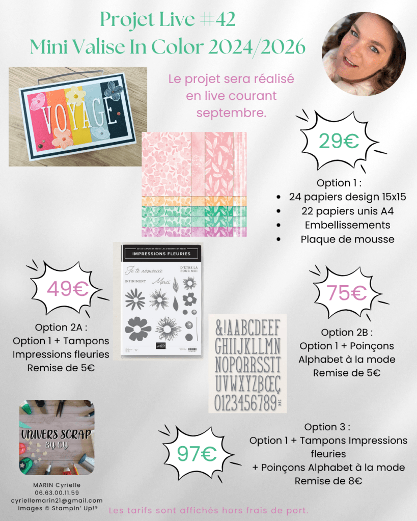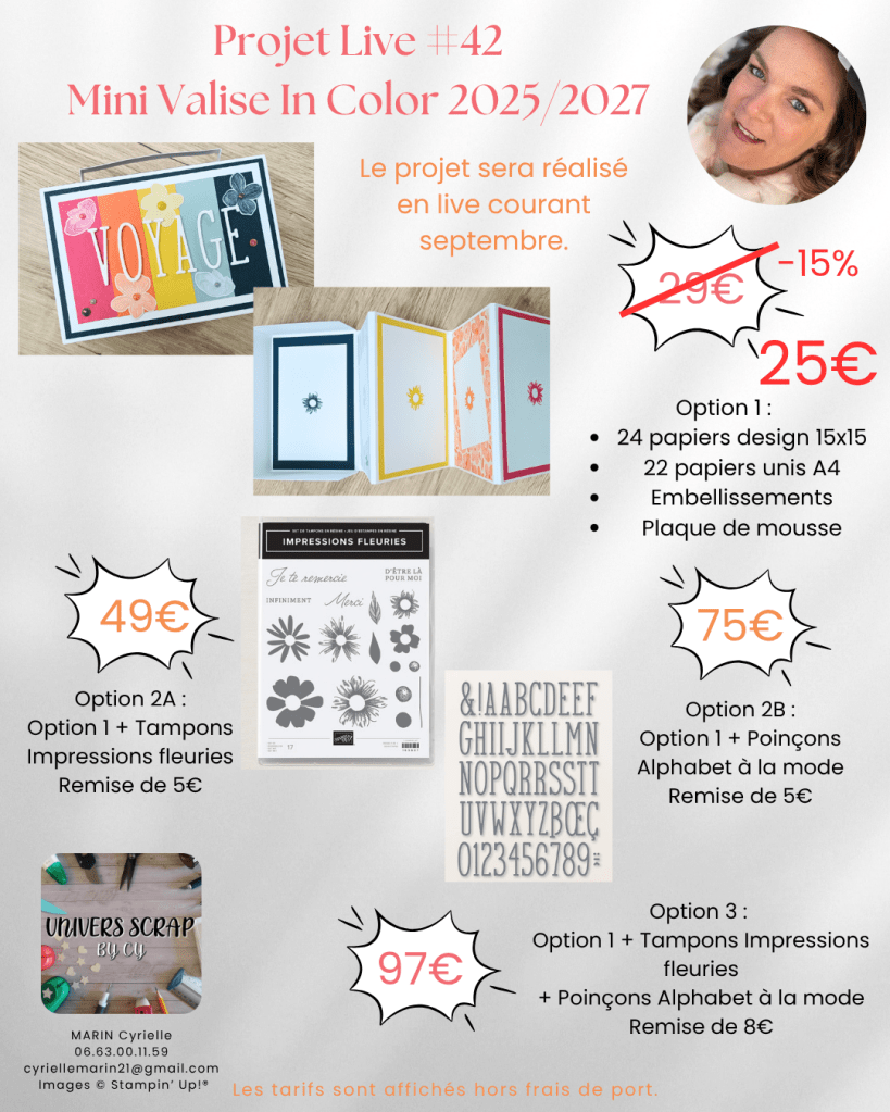 En septembre, rejoins-nous en live pour un projet créatif unique : un mini-album façon valise souvenir, réalisé avec les nouvelles InColor 2025‑2027 ou 2024‑2026 de Stampin’ Up ! Découvrez ci‑dessous tous les détails pour réserver ton kit et participer.