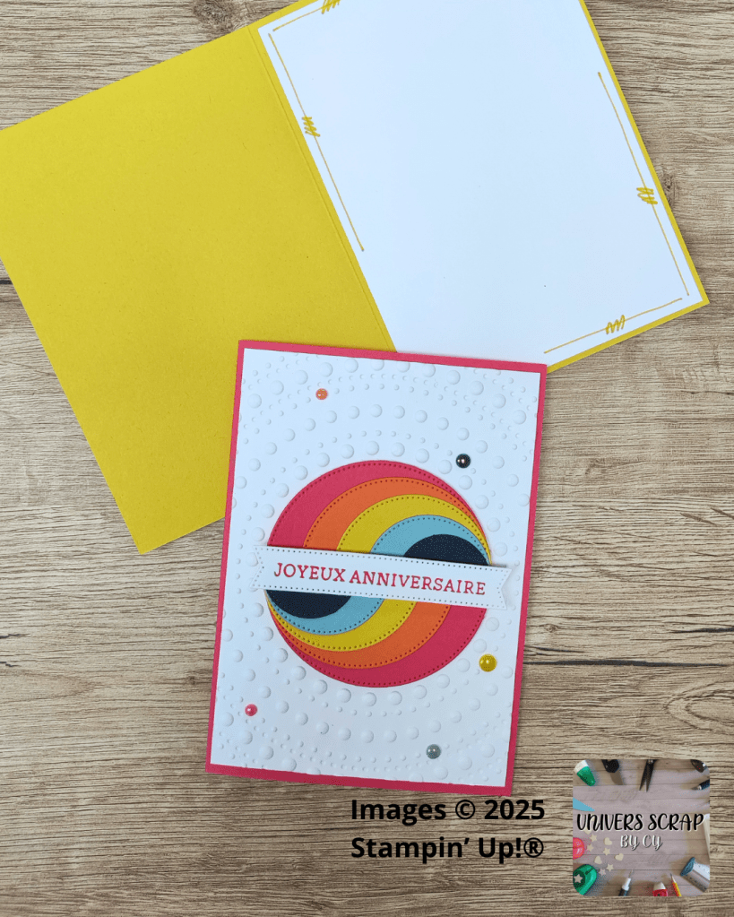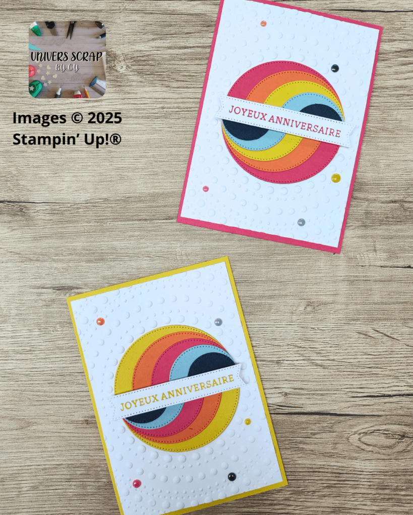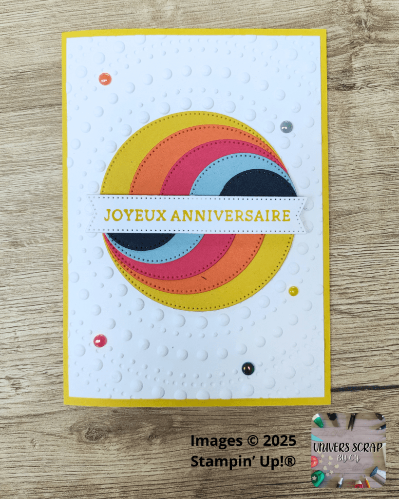 Tu veux créer une carte impactante avec peu de matériel ? Ce projet est pour toi ! Il te suffit de 5 cercles, une étiquette et un fond embossé pour un rendu graphique et super tendance.