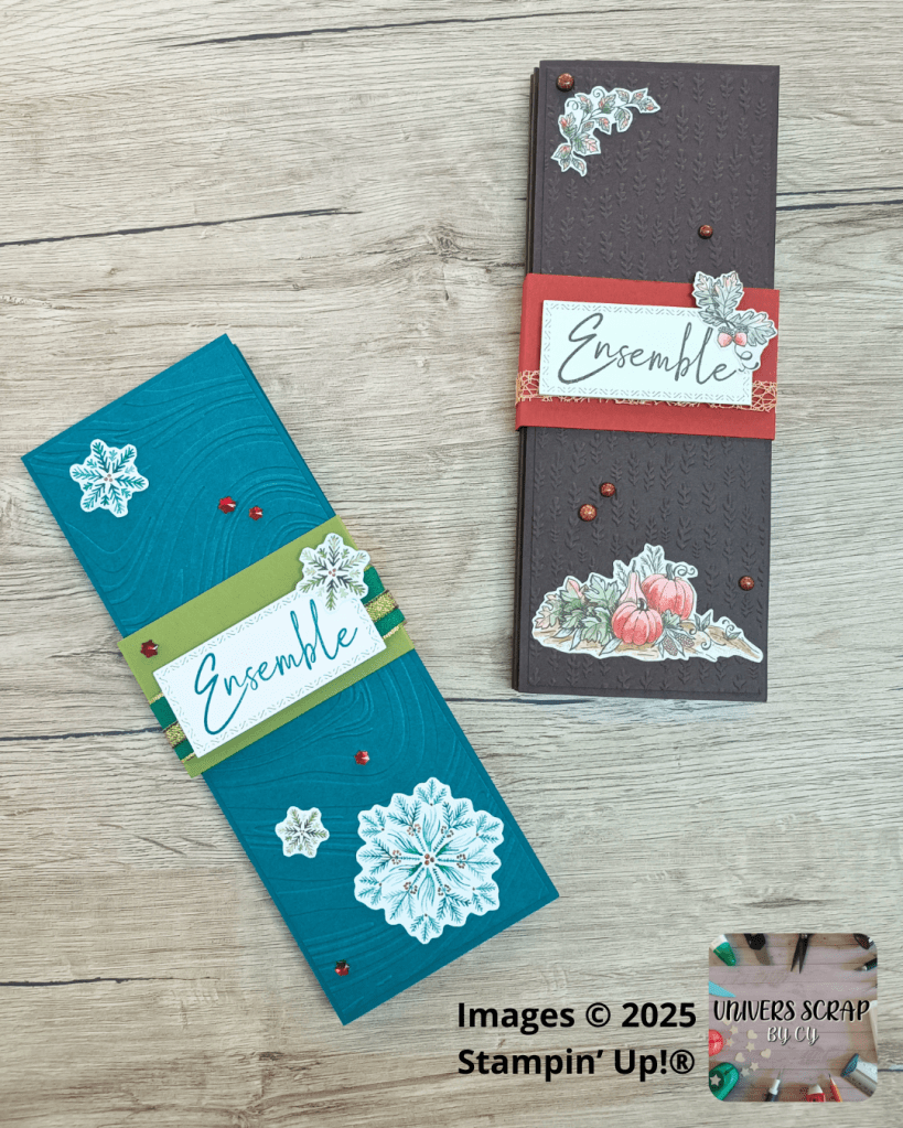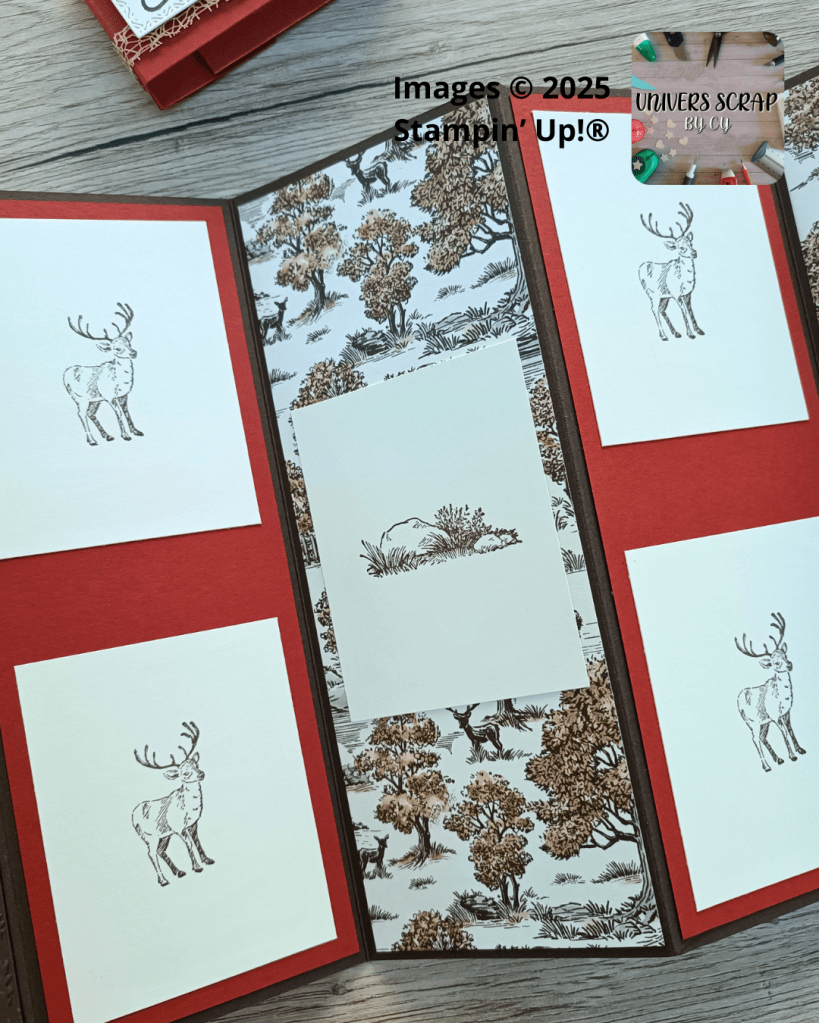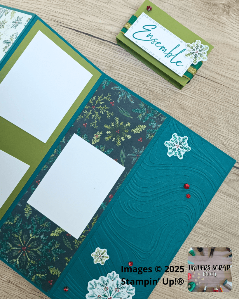 Pour cette nouvelle version, j’ai choisi de travailler avec la superbe collection Flocons de pin élégants, accompagnée de papiers unis coordonnés Vert olive et Paon pimpant. Une harmonie de couleurs parfaite pour mettre en valeur jusqu’à 15 photos dans un format pratique et raffiné.