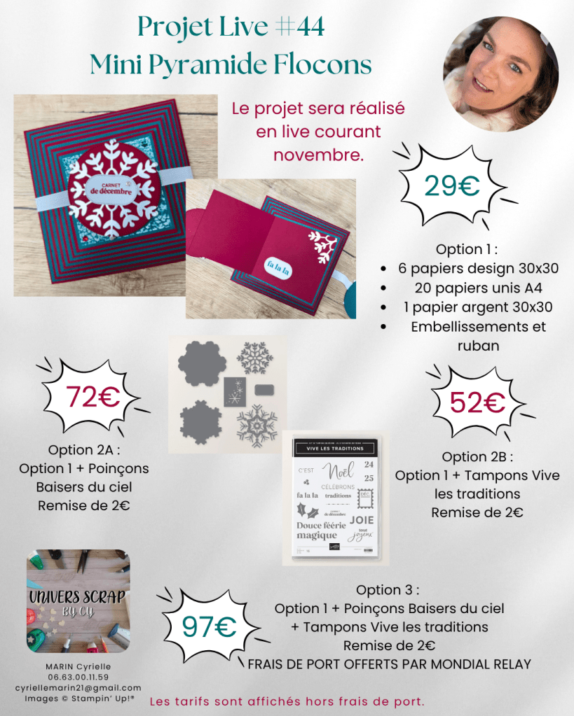 Ce mini-album pyramidal a été imaginé pour capturer l’esprit festif de la saison avec la magnifique collection Flocons de pin élégants, et les papiers Paon pimpant et Cerise carmin.