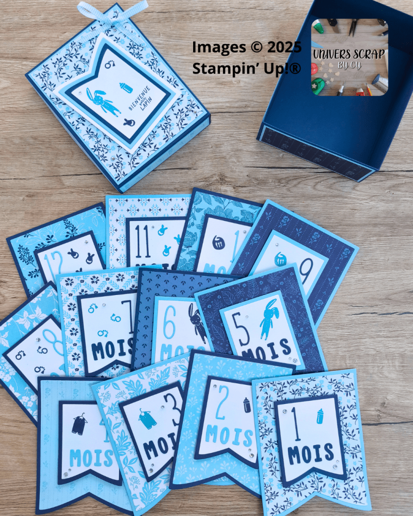 Nous réaliserons une boîte accompagnée de cartes étapes pour bébé, un projet idéal pour conserver de précieux souvenirs.